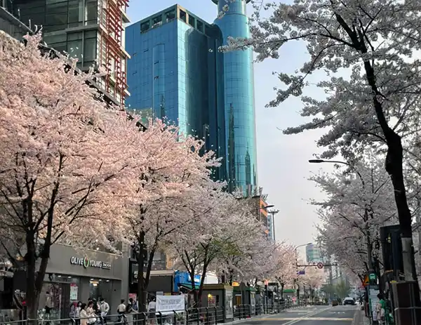 벚꽃이 만발한 거리를 거닐며, 한강의 아름다운 경치와 함께 도시 속 자연의 아름다움을 느낄 수 있습니다.