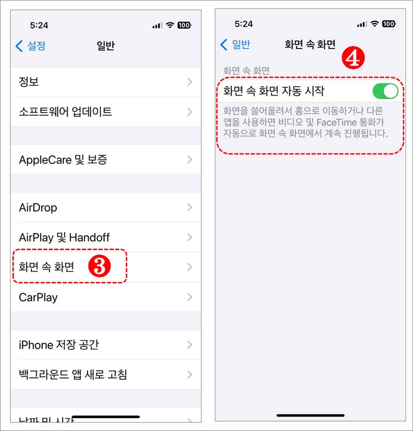 1번의 설정 - 2번 일반 - 3번 화면 속 화면 - 4번 화면 속 화면 자동 시작 활성화