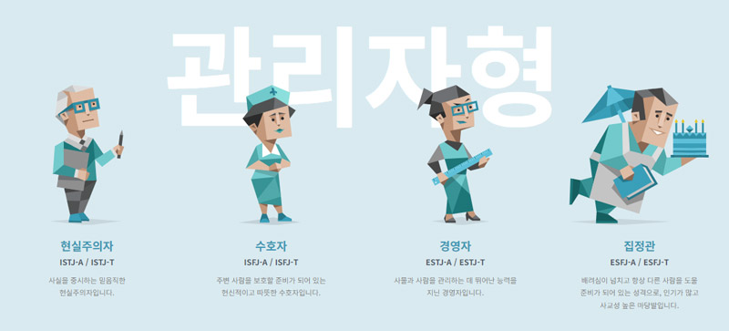 이들은 규칙 범위 내에서 일을 처리하는 데 능숙합니다. 관리자 유형은 청렴 결백한 논리주의자이거나, 용감한 수호자이거나 엄격한 관리자이거나 사교적인 외관입니다.