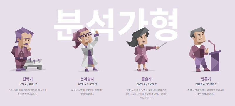 분석가 유형은 용도 주도한 전략가이거나, 논리적인 사색가이거나, 대담한 통솔자이거나, 뜨거운 논쟁을 즐기는 변론가입니다.